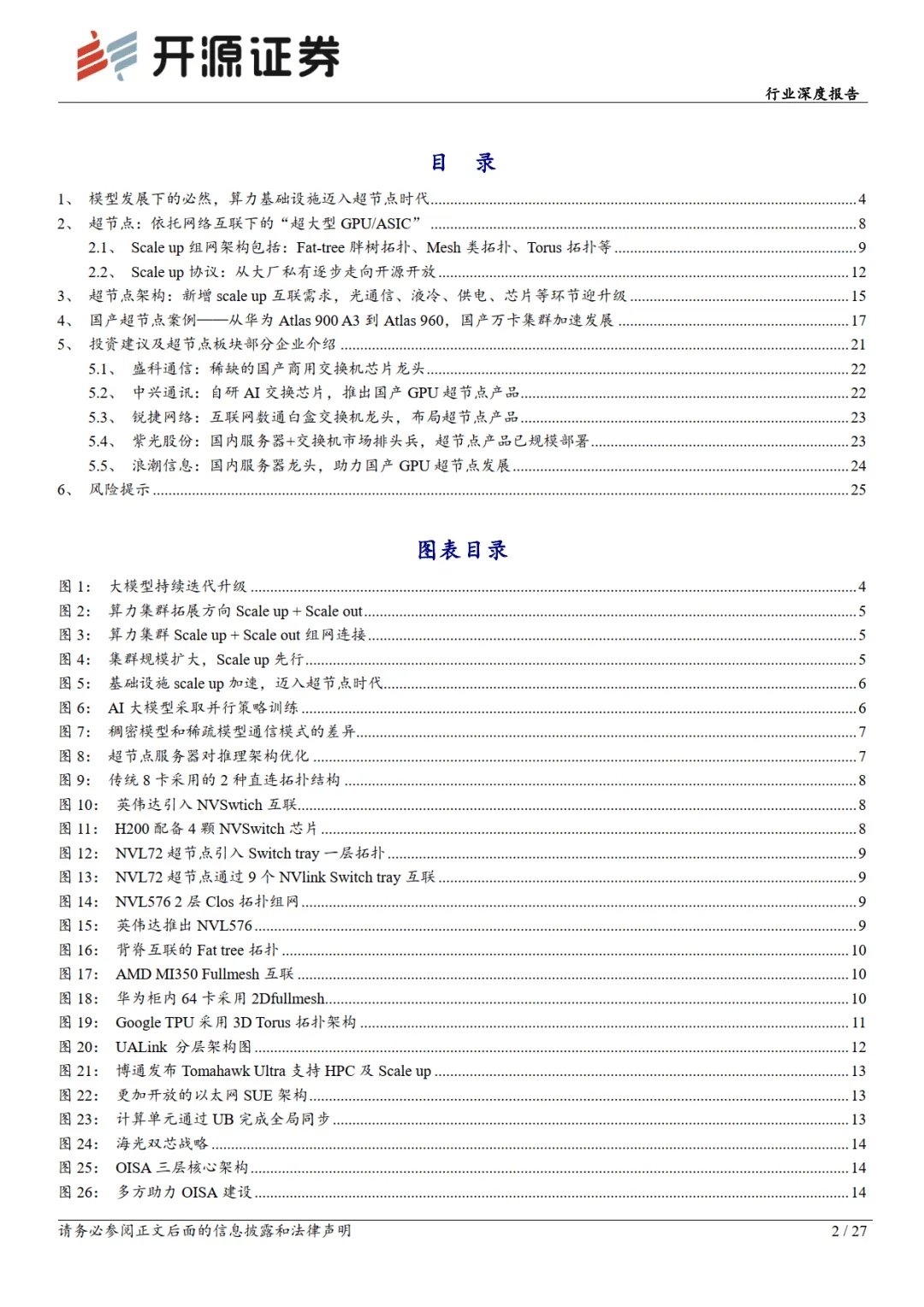 开源证券 2026 年 1 月 28 日发布的通信行业深度报告指出,AI 模型迭代推动算力需求激增,算力基础设施迈入超节点时代,超节点带动光、液冷、供电、芯片等环节全面升级,国产超节点集群发展迅猛,相关产业链迎来长期投资机遇,行业投资评级维持看好。————