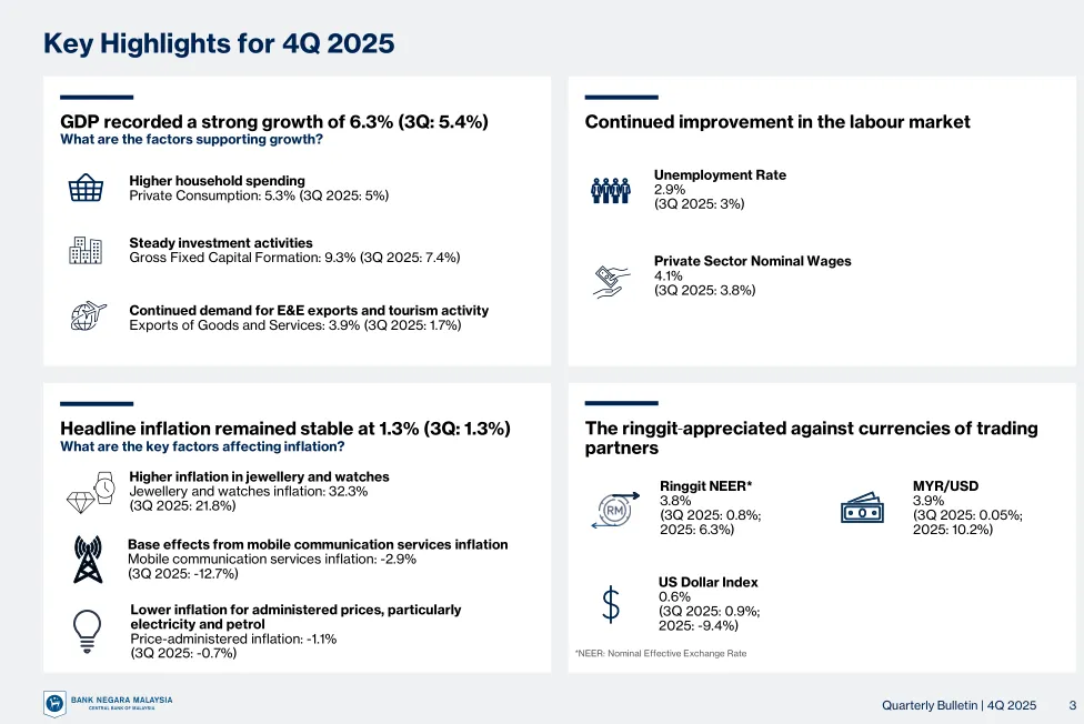 第四季度标题通胀率(Headline Inflation)保持在1.3%的低位,与第三季度持平。然而,核心通胀率(Core Inflation)上升至2.3%,这主要由两个特定因素驱动:一是珠宝和手表价格受全球金价影响飙升了32.3%;二是移动通信服务价格在2024年10月的低基数效应消失后出现的会计性上涨。由于政府对电力和燃油价格采取了行政干预,标题通胀率得以保持在较低水平。然而,这种低通胀环境正面临潜在的结构性挑战,尤其是随着2026年逐步推行的补贴合理化政策,市场对通胀预期的关注度正在上升。3.2 货币政策:马来西亚国家银行的“定力”