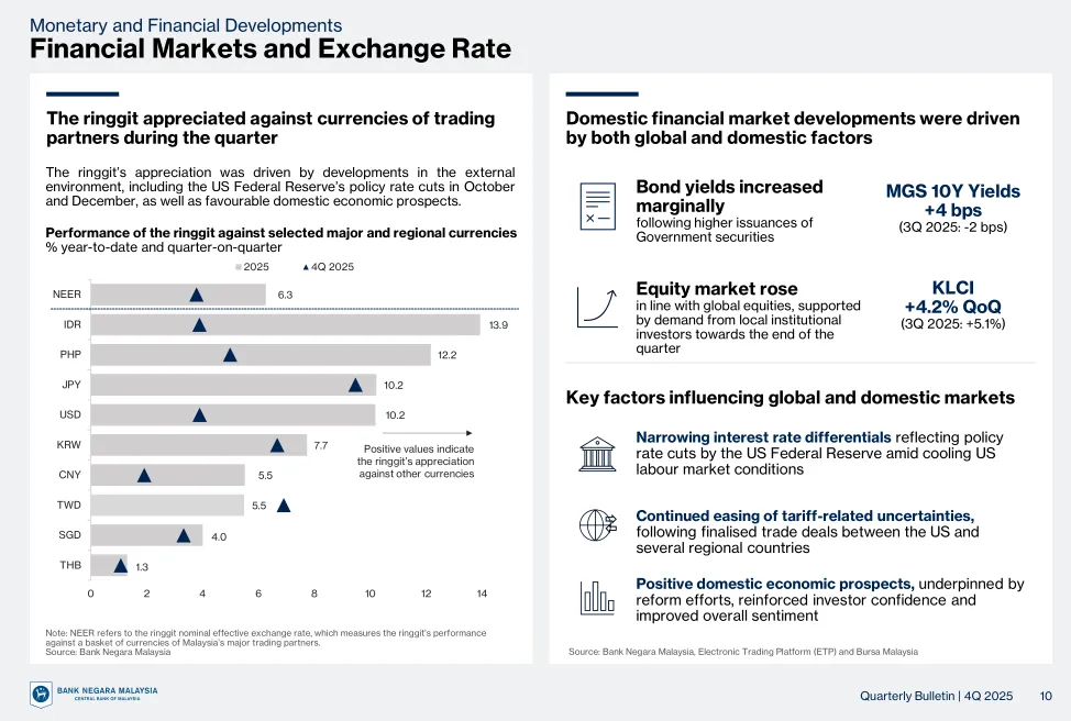 第四季度,出口同比增长11.0%,而进口增速则跃升至12.6%。进口的大幅增长主要由用于制造业扩产的中间产品和支撑基础设施建设的资本货物驱动。尽管这导致第四季度经常账户盈余收窄至20亿令吉(占GDP的0.4%),但这种盈余的减少更多反映了国内投资活动的活跃,具有积极的宏观经济意义。4.2 令吉汇率:重回升值通道