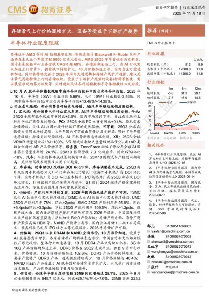 2025年11月发布的这份深度报告显示,全球半导体行业正经历由AI革命驱动的结构性变革。与往年不同的是,本轮周期的核心驱动力已从传统的消费电子转向AI算力基础设施和高端存储需求,同时叠加国内自主可控进程加速,形成了独特的"双轮驱动"格局。