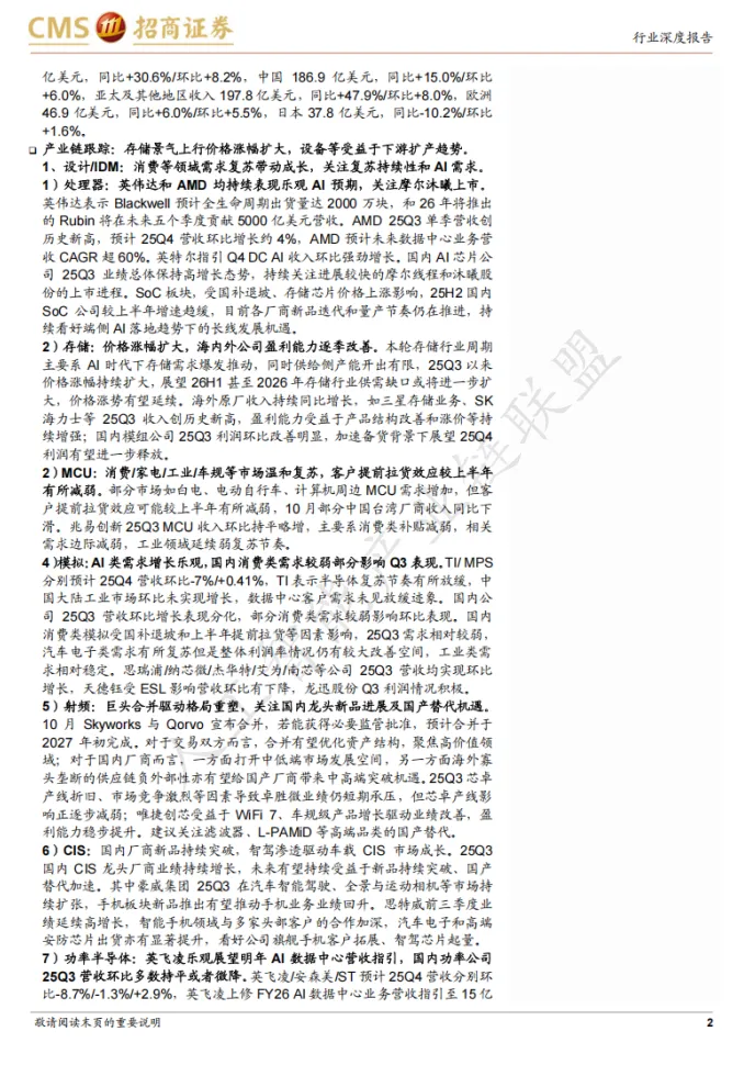 模拟芯片:AI类需求增长乐观,国内消费类需求较弱。TI、MPS分别预计第四季度营收环比-7%/+0.41%。TI表示半导体复苏节奏有所放缓,中国大陆工业市场环比未实现增长,但数据中心客户需求未见放缓迹象。国内消费类模拟受国补退坡和上半年提前拉货等因素影响,第三季度需求相对较弱,但汽车电子类需求有所复苏。