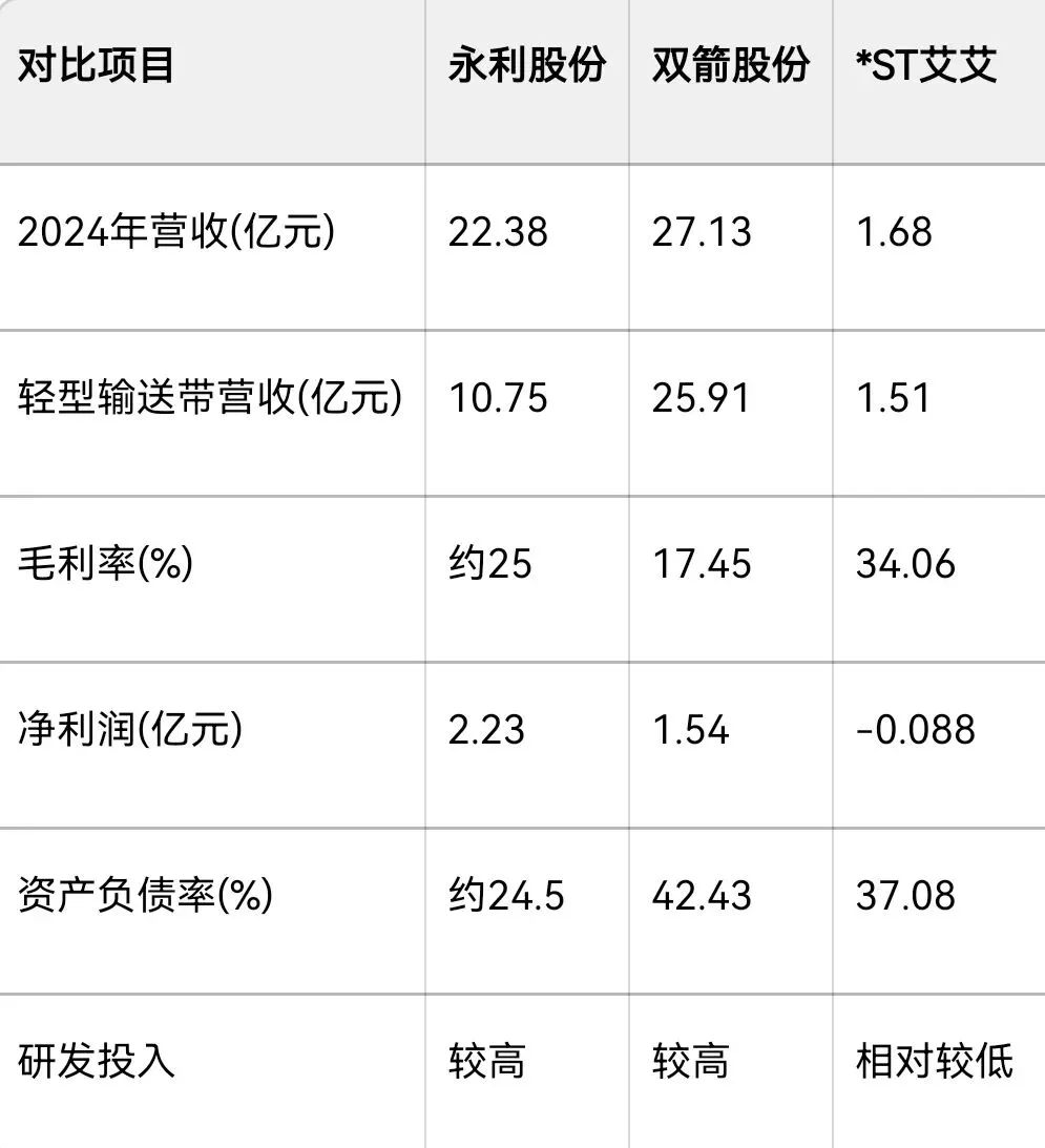 3. 毛利率优势:*ST艾艾毛利率34.06%,显著高于双箭股份的17.45%,但低于永利股份。