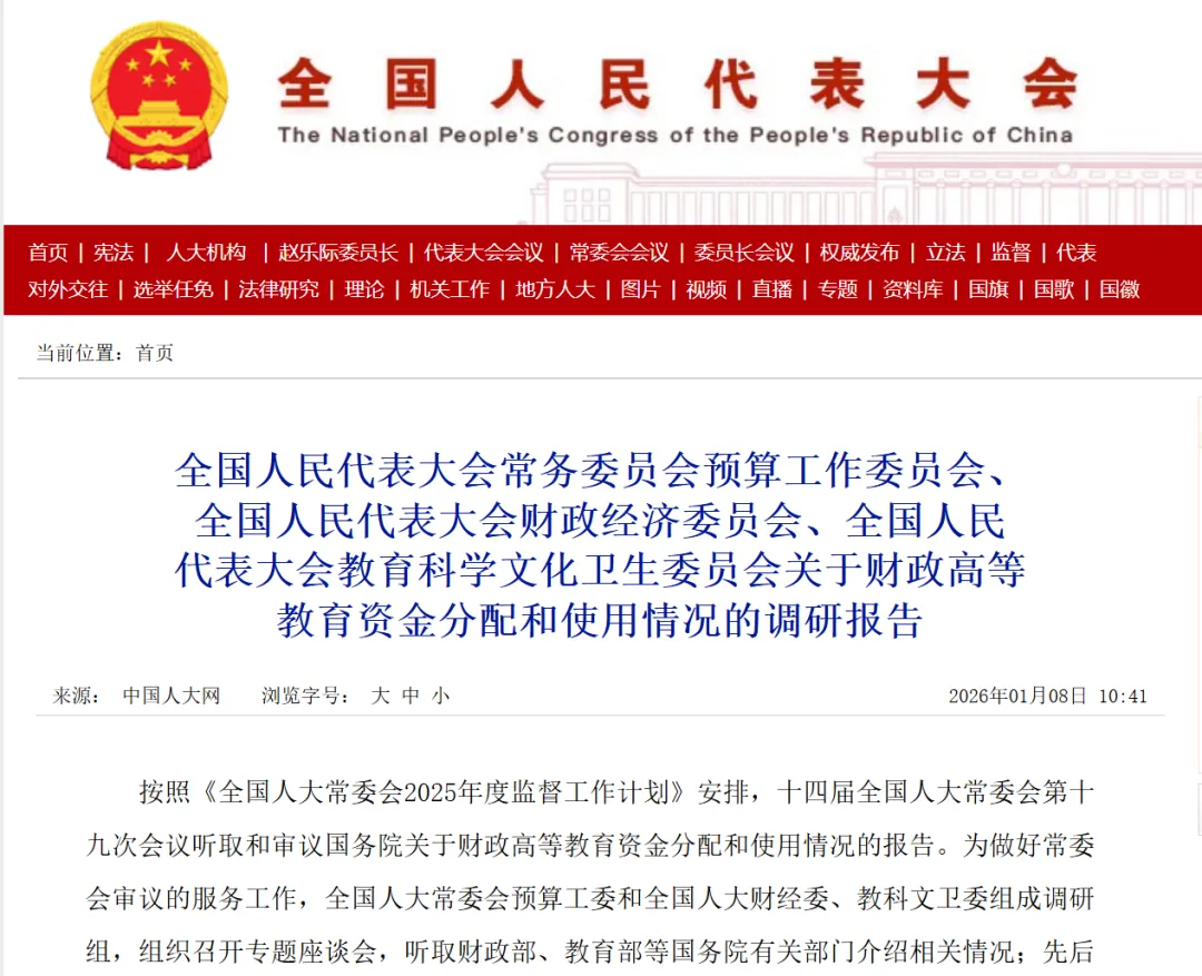 1月8日,中国人大网发布《全国人民代表大会常务委员会预算工作委员会、全国人民代表大会财政经济委员会、全国人民代表大会教育科学文化卫生委员会关于财政高等教育资金分配和使用情况的调研报告》(以下简称《调研报告》)。