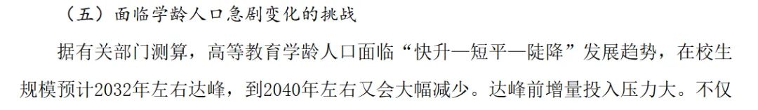 按照2022年供给不变方案测算,小学最先在2024年出现供给过剩,初中约在2031年、普通高中和中等职业教育约在2035年、高等教育约在2037年出现过剩。