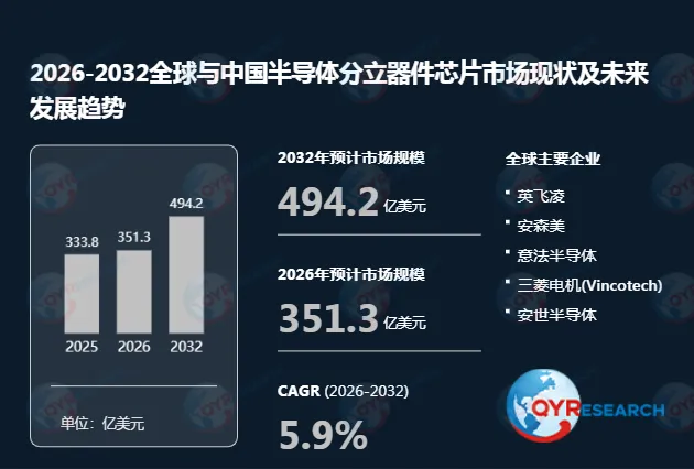根据QYR(恒州博智)的统计及预测,2025年全球半导体分立器件芯片市场销售额达到了333.8亿美元,预计2032年将达到494.2亿美元,年复合增长率(CAGR)为5.9%(2026-2032)。
