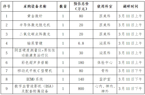 3.调研日期:编号1-6设备2026年3月11号(周三)上午8:30,编号7-9设备2026年3月11日(周三)下午13:30,调研地点:门诊四楼第一会议室;