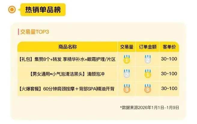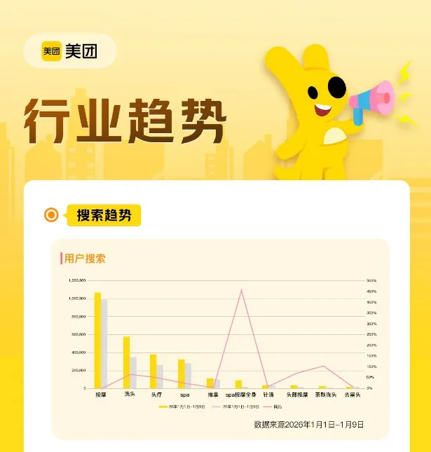 搜索热度:按摩、SPA、头疗、洗头始终是用户核心搜索项,茶麸洗头、男士SPA、去黑头等分赛道在年末快速升温;春节期间“全身SPA”“头部按摩”因出行热潮迎来高峰,节后“头皮唤醒”“全身舒缓”等缓解疲劳的服务需求显著提升。