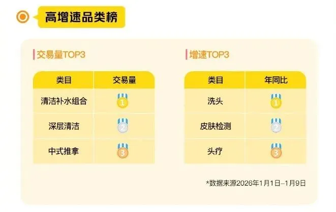 增速表现:「洗头」连续三个月位居增速TOP1,「头疗」「皮肤检测/产后修护」紧随其后,精细化护理、场景化修护成为消费升级核心方向。