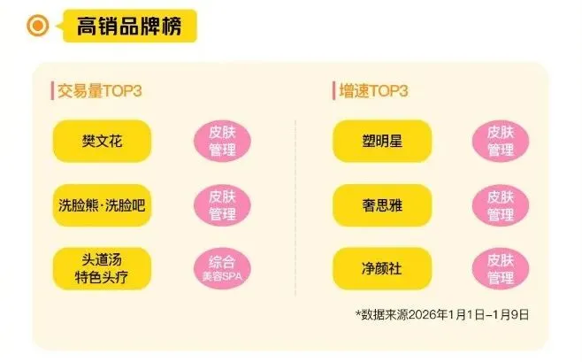交易量TOP3品牌:樊文花(面部护理)、洗脸熊·洗脸吧(专业清洁)持续领跑,第三品牌随阶段需求在「头道汤(中医头疗)」「洗脸猫(瘦身纤体)」间切换,清晰的单品类聚焦战略是核心竞争力。
