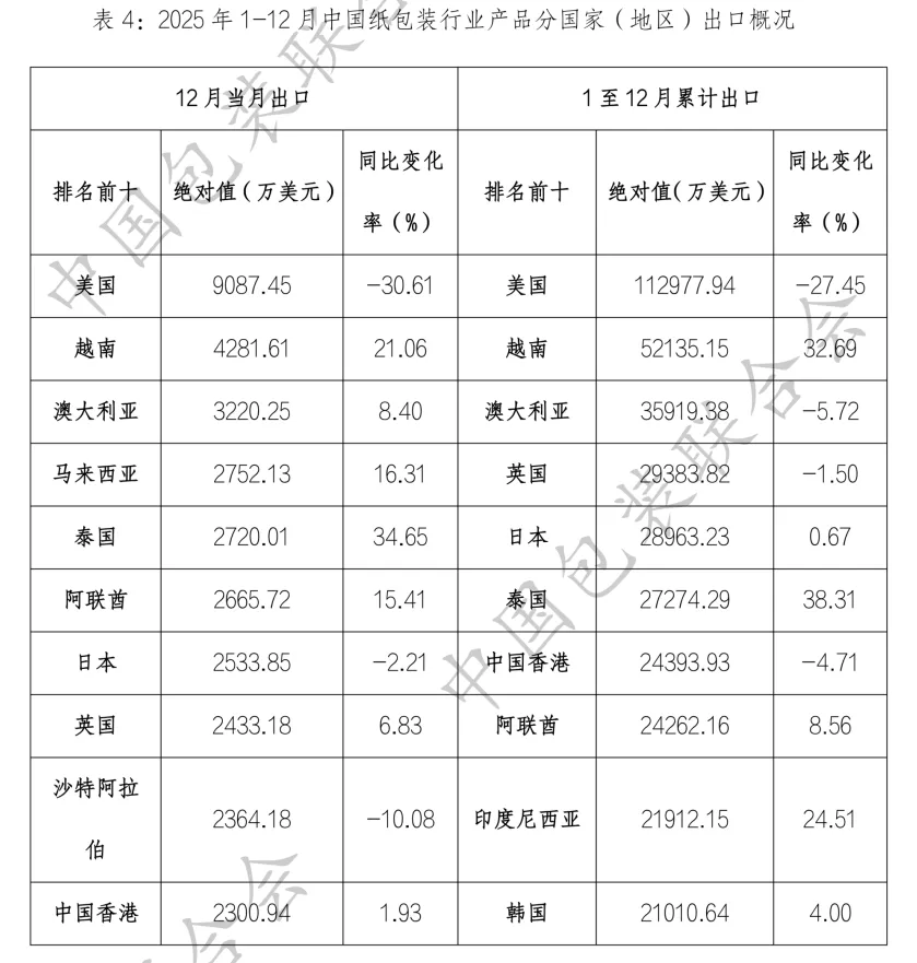 2025年1-12月,中国纸包装行业产品出口前三大贸易伙伴分别为美国、越南、澳大利亚。出口金额分别为112977.94万美元、52135.15万美元、35919.38万美元,同比增速分别为-27.45%、32.69%、-5.72%。