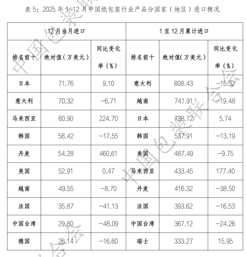 2025年1-12月,中国纸包装行业产品进口前三大贸易伙伴分别为意大利、越南、日本。进口金额分别为808.43万美元、741.91万美元、738.72万美元,同比增速分别为-15.52%、-19.48%、5.74%。