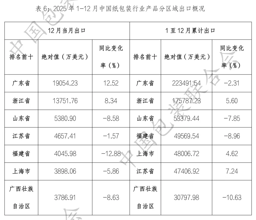 2025年12月,中国纸包装行业产品前三大出口省市为广东、浙江、山东,出口金额分别为19054.23万美元、13751.76万美元、5380.90万美元,同比增速分别为12.52%、8.34%、-8.58%。