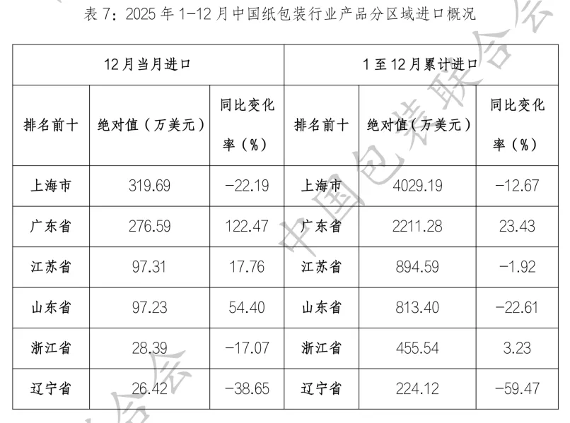 2025年12月,中国纸包装行业产品前三大进口省市为上海、广东、江苏,进口金额分别为319.69万美元、276.59万美元、97.31万美元,同比增速分别为-22.19%、 122.47%, 17.76%