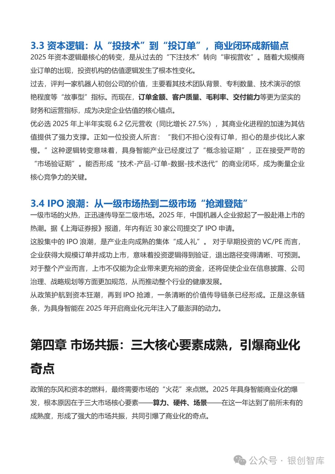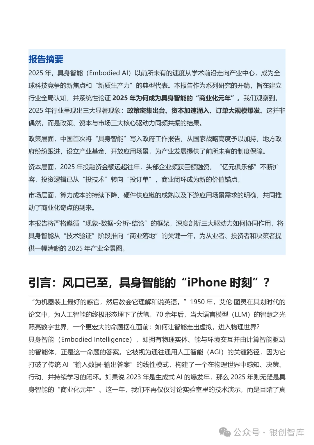 从特斯拉 Optimus 上调量产预期,到国内优必选、智元机器人等企业订单总额突破 90 亿元;从全球人形机器人出货量同比激增 508%,到中国在人形相关专利申请上遥遥领先,具身智能正以前所未有的姿态,重构生产与生活的形态。站在这一历史性起点,我们看到的不仅是一场技术革命,更是全球产业格局的重新洗牌。本报告立足 2025 年具身智能产业全景,从政策、资本、市场三大维度,拆解其商业化爆发的核心逻辑,剖析产业发展的底层动力,为从业者、投资者和决策者勾勒这幅属于未来的产业蓝图,探寻智能时代的产业机遇与发展方向。