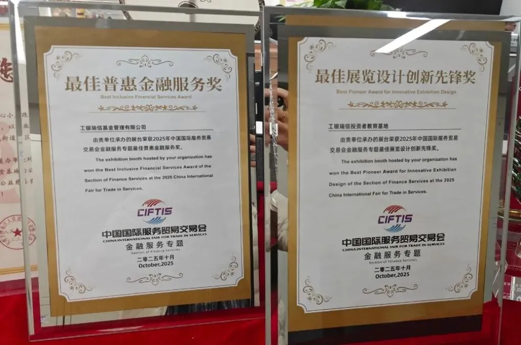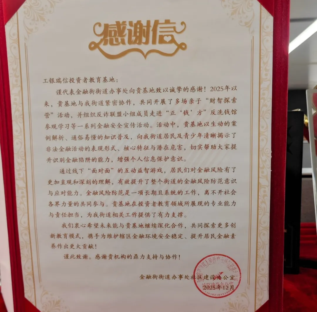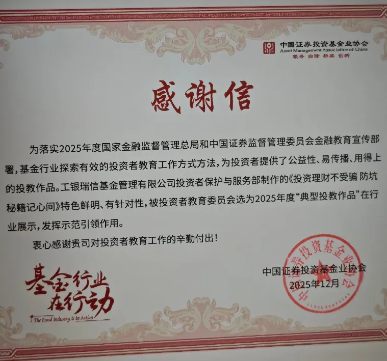 凭借一系列扎实创新的投教实践与普惠措施,工银瑞信投教工作赢得了行业、媒体与社区的广泛认可与支持。2025年先后斩获中国证券报《大学生投教创新金牛奖》、证券时报《最受投资者欢迎投教IP奖》、人民网财经《人民企业社会责任案例-工银瑞信投资者教育基地》、服贸会委员会2025年《最佳普惠金融服务奖》和《最佳展览设计创新先锋奖》、北京证券业协会“投保午间一小时”活动《优秀组织奖》、第二届“中金所杯”全国高校金融财商辩论赛《杰出组织奖》和《金财奖》、新浪财经《最佳投资者教育基金公司》、北京证券业协会《首都证券之窗》2025年征文稿件先进单位通报,收到来自街道、社区、协会、机构的感谢信7封、锦旗1面,品牌影响力与公信力持续彰显。