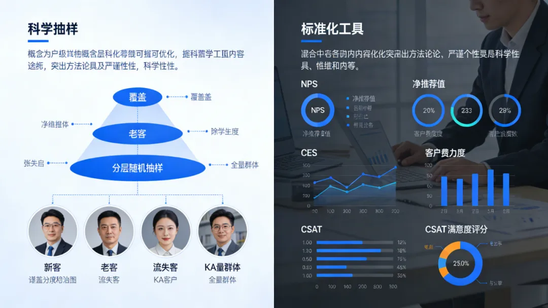 科学抽样:分层随机抽样,覆盖新客、老客、流失客、KA客户等全量群体;
