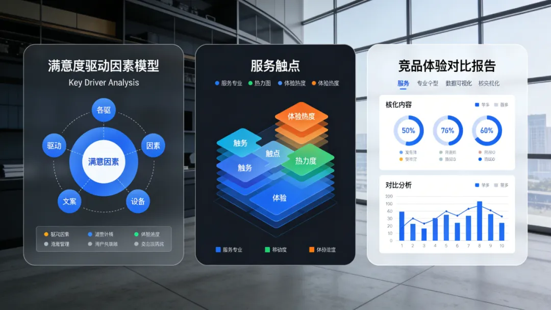 SSC特色服务:满意度驱动因素模型(Key Driver Analysis)|服务触点热力图|竞品体验对标报告
