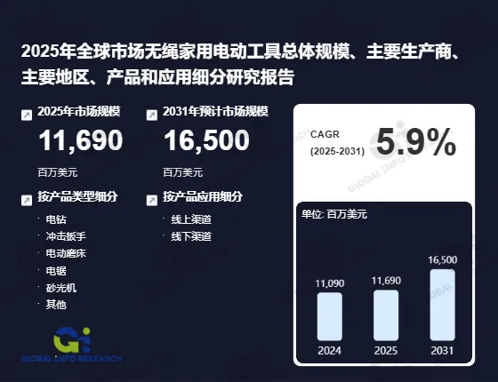在全球“宅经济”持续发酵与 DIY 文化日益普及的推动下,无绳家用电动工具市场正迎来黄金发展期。据GIR (Global Info Research)调研数据显示,2024年全球该领域收入大约为11090百万美元。随着电池续航能力的突破及无刷电机技术的广泛应用,预计市场规模将在2031年大幅跃升至16500百万美元。在2025至2031年期间,市场预计将保持5.9%的年复合增长率(CAGR),显示出行业正处于一个量质齐升的快速扩张通道。