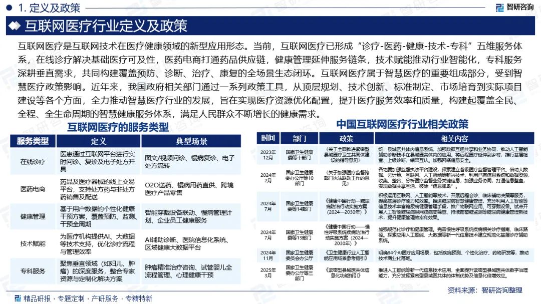 行业相关政策:互联网医疗属于智慧医疗的重要组成部分,受到智慧医疗政策影响。近年来,我国政府相关部门通过一系列政策工具,从顶层规划、技术创新、标准制定、市场培育到实际项目建设等各个方面,全力推动智慧医疗行业的发展,旨在实现医疗资源优化配置,提升医疗服务效率和质量,构建起覆盖全民、全程、全生命周期的智慧健康服务体系,满足人民群众不断增长的健康需求。互联网医疗于2015年7月被纳入国务院《关于积极推进“互联网+”行动的指导意见》,提出推广医疗卫生在线服务及医疗数据共享。2018年7月,国家卫健委等部门发布《互联网诊疗管理办法(试行)》等文件,规范行业准入标准。2020年防疫期间,全国医院及平台大规模推行在线诊疗服务;2月21日,《关于加强医疗机构药事管理促进合理用药的意见》发布,规范“互联网+药学服务”;4月7日,《关于推进“上云用数赋智”行动培育新经济发展实施方案》发布,首次从国家层面提到互联网医疗可以首诊并纳入医保;7月22日,国务院常务会议部署加强新型城镇化建设,提出进一步深挖内需潜力。截至2021年6月,中国在线医疗用户规模达2.39亿。2023年农村互联网医疗用户占比达21.5%,较2022年增长4.1个百分点。2024年7月,国家卫生健康委等13部门印发《健康中国行动——慢性呼吸系统疾病防治行动实施方案(2024—2030年)》,加强规范化诊疗和健康管理。完善慢性呼吸系统疾病相关诊疗指南、临床路径。探索应用人工智能、大数据等新一代信息技术建立规范化基层诊疗辅助系统。2025年3月,国家卫生健康委办公厅等三部门印发《紧密型县域医共体信息化功能指引》,推进人工智能等新一代信息技术应用,全面提升紧密型县域医共体数字治理能力,充分发挥紧密型县域医共体的体制优势及信息化倍增效应。2025年,国家医保局提出预设“互联网首诊”价格项目,待技术条件成熟后将全面开放;国家卫生健康委员会等五部门联合印发政策文件,明确要求到2030年实现基层诊疗智能辅助应用基本全覆盖。