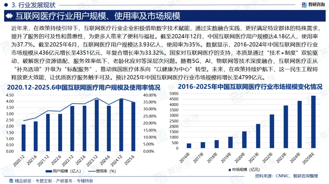互联网医疗又称在线医疗,是互联网技术在医疗健康领域的新型应用形态。当前,互联网医疗已形成“诊疗-医药-健康-技术-专科”五维服务体系,在线诊疗解决基础医疗可及性,医药电商打通药品供应链,健康管理延伸服务链条,技术赋能推动行业智能化,专科服务深耕垂直需求,共同构建覆盖预防、诊断、治疗、康复的全场景生态闭环。近年来,在政策持续引导下,互联网医疗行业企业积极借助数字技术赋能,通过实数融合实践,更好满足特定群体的特殊需求,提升了服务的可及性和普惠性,为更多人带来了便利与福祉。截至2024年12月,中国互联网医疗用户规模达4.18亿人,使用率为37.7%。截至2025年6月,互联网医疗用户规模达3.93亿人,使用率为35%。数据显示,2016-2024年中国互联网医疗行业市场规模从436亿元增长至4351亿元,年复合增长率为33.32%。国家对互联网医疗的支持,本质是通过“技术+制度”双轮驱动,破解医疗资源错配、服务效率低下、老龄化应对等深层次问题。随着5G、AI、物联网等技术深度融合,互联网医疗正从“补充选项”升级为“标配服务”,推动我国医疗体系向“以健康为中心”转型。未来,在政策持续护航下,这一民生工程将释放更大效能,让优质医疗服务触手可及。预计2025年中国互联网医疗行业市场规模将增长至4799亿元。中国互联网医疗行业的竞争主体主要分为综合服务平台与专业服务企业两类。综合服务平台以平安好医生、阿里健康、京东健康等为代表,通过整合在线诊疗、医药电商及健康管理等服务构建生态闭环;专业服务企业则包括九安医疗、卫宁健康、微医等,依托医疗硬件、信息化系统或垂直领域服务形成专业化优势。两类主体在各自领域深化布局的同时,正通过技术协同与业务融合,共同驱动行业向全周期、数字化的健康服务体系演进。