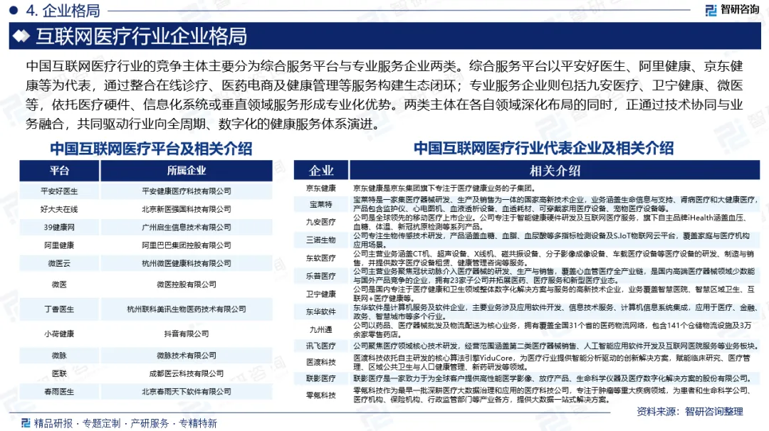 企业格局:中国互联网医疗行业的竞争主体主要分为综合服务平台与专业服务企业两类。综合服务平台以平安好医生、阿里健康、京东健康等为代表,通过整合在线诊疗、医药电商及健康管理等服务构建生态闭环;专业服务企业则包括九安医疗、卫宁健康、微医等,依托医疗硬件、信息化系统或垂直领域服务形成专业化优势。两类主体在各自领域深化布局的同时,正通过技术协同与业务融合,共同驱动行业向全周期、数字化的健康服务体系演进。