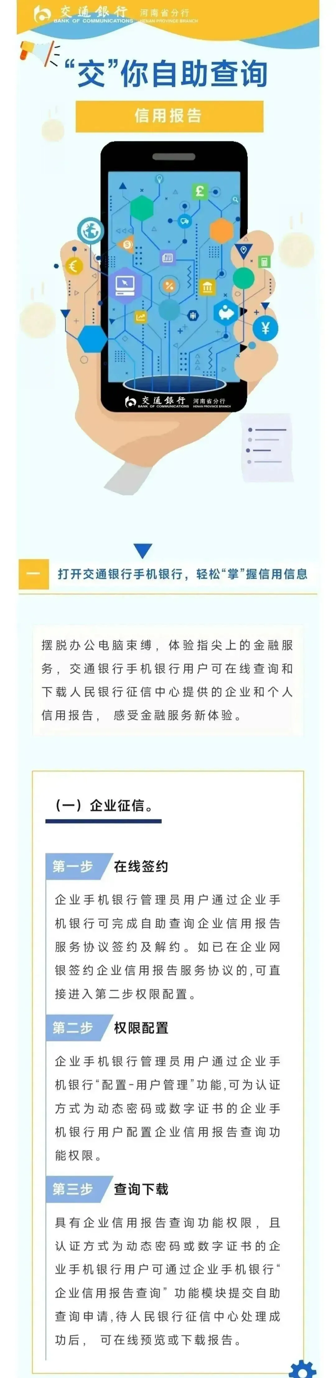 传统查询企业征信报告只能去线下央行网点打印,费时又费力;现今,可以通过企业网银或者手机企业银行进行线上查询,足不出户就能拿到报告,方便又快捷。