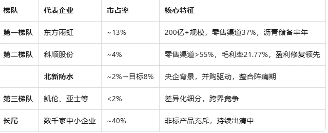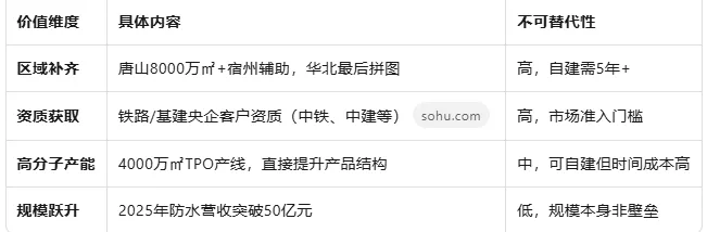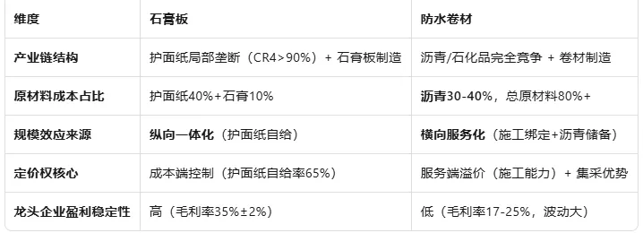 竞争本质:防水卷材的竞争优势不在产能规模,而在原材料储备能力(成本端)和施工服务能力(收入端),这与石膏板的"纵向一体化"逻辑截然不同。