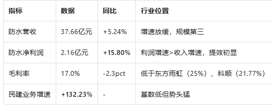 行业判断:防水材料行业处于周期底部+整合加速阶段,需求端无复苏迹象,供给端出清持续,结构性机会大于总量机会。