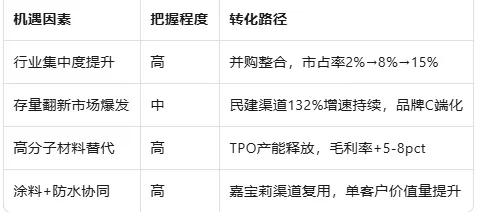 防水涂料 | ~17% | >40% | 施工便捷,零售属性强,毛利高 | 工程渠道占比高,家装渗透慢 |