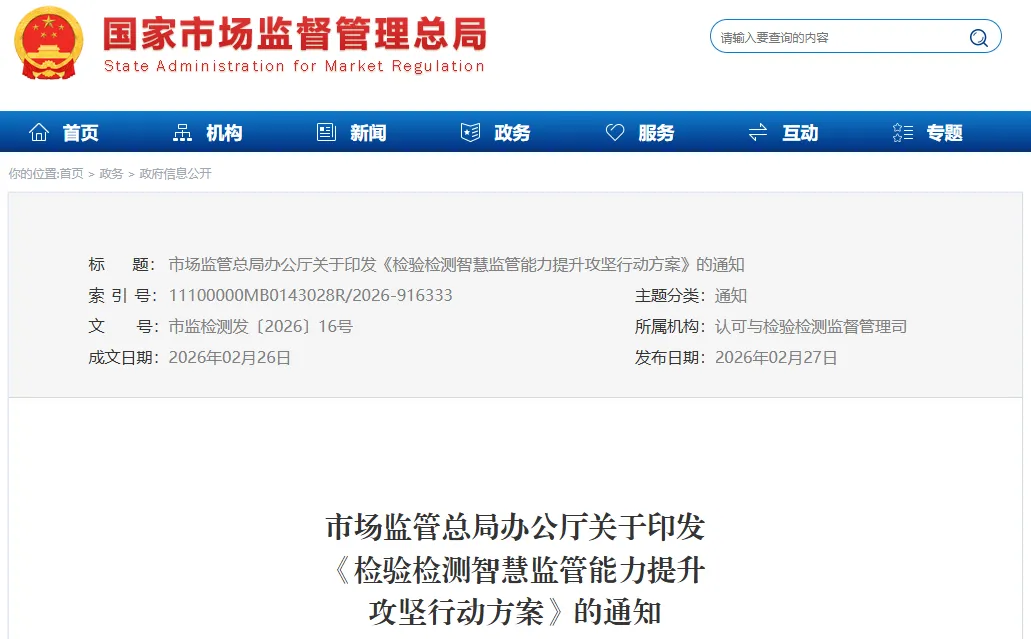 2月27日,市场监管总局办公厅印发《检验检测智慧监管能力提升攻坚行动方案》(以下简称《行动方案》),提出力争到2027年底,全国统一的检验检测智慧监管平台基本建成,数据集成共享全面实现,人工智能、大数据等新技术深度应用,智慧化审评、穿透式监管等新方式广泛推行,上下贯通、左右联通的智慧监管格局有效建立,检验检测监管效能显著提升。《行动方案》要求,制定统一赋码验证规则,并建设检验检测报告统一赋码验证系统(模块),为每一份检验检测报告制发全国唯一的编号作为“身份标识”,实现报告防篡改、可追溯、能鉴真。