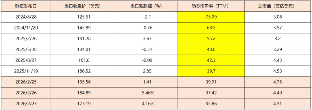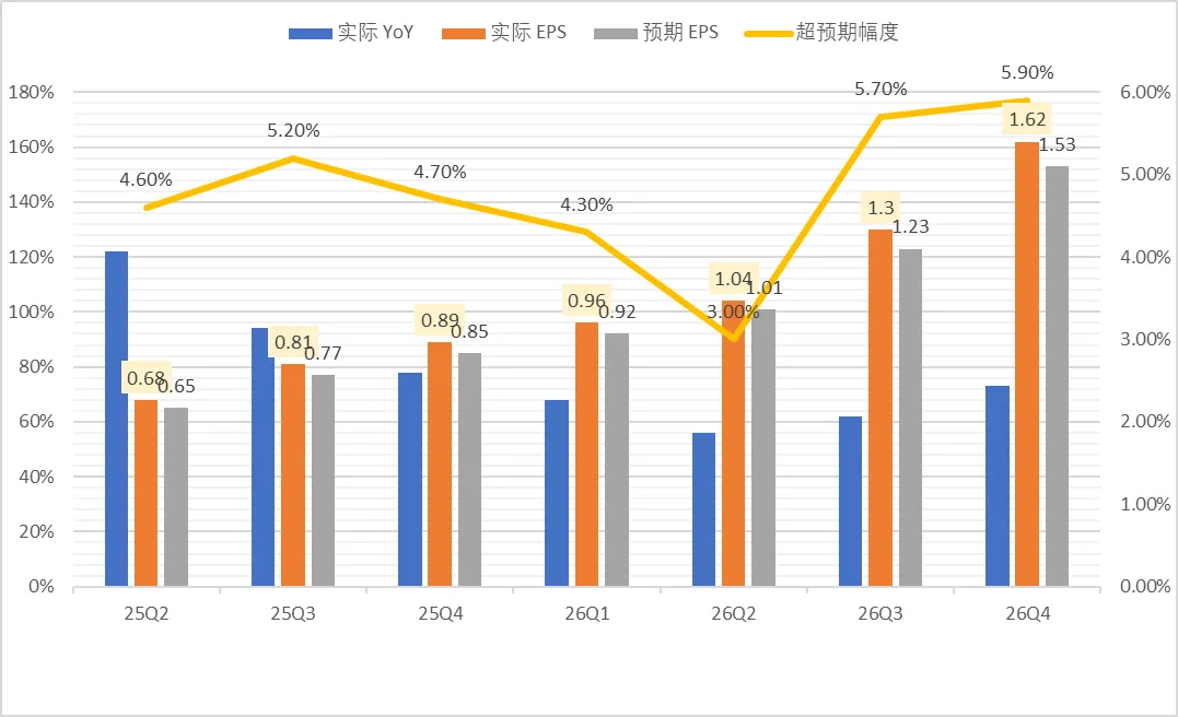 先看营业收入数据,那是每一财报季度都是超预期,只是超的幅度大小不同而已。财年末期第4季度财报发布后,一般股价都会卡卡往下调整一段,来看看历史数据,25年2月26日那个财报后也是调整比现在还猛。是不是线路太多,看的头晕,那咱们搞个简单点的玄学,直接用上涨天数/财报发布后的交易天数比例,只有财报发布后的第8天和第10天才是100%上涨,第4天,第7天超过50%上涨。再继续回顾一下这个最新的财报数据和评价,实际EPS创新高,EPS超预期幅度创新高。请问担心到底来自于对利益的情绪恐惧,还是真实理智的判断,或者只是某些机构的操弄人性??