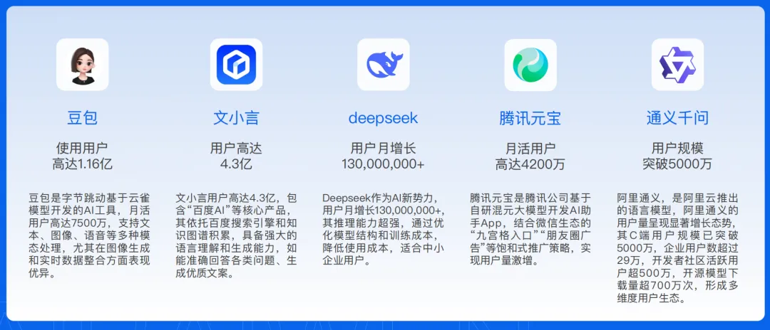 核心逻辑:智能交互式流量,突破 “人找信息” 和 “信息找人” 的二元对立,通过大模型的自然语言理解、多模态交互、个性化推理能力,实现 “人 - 需求 - 信息 / 服务 / 商品” 的精准匹配,流量分发由 “需求理解的深度” 决定,平台是 “智能助手 + 解决方案提供者”,解决的是 “需求高效满足” 和 “决策成本降低” 问题。代表平台:字节跳动豆包、腾讯元宝、阿里通义千问、百度文心一言、DeepSeek 等大模型产品,以及搭载大模型的垂类应用(AI 电商、AI 教育、AI 办公)