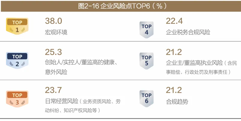日常经营风险、企业税务合规风险是企业主最担心发生的企业风险。对于大多数企业主来说,融资、增资减资是企业低频行为,并不会经常发生,反而是企业日常经营中会遇到各种意想不到的风险,比如来自员工的劳动纠纷、来自合作伙伴和客户的业务合作争议、来自同业的专利和知识产权纠纷、来自监管的税务合规风险等。因此,企业主们迫切希望能借助专业法律服务或各类风险工具来为企业的长远稳健经营保驾护航。