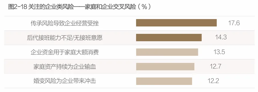 在家企之间的交叉风险方面,企业家最关心代际传承风险,即子女接不了班、不愿意接班、接班过程动荡不安等问题。具体地,“传承风险导致企业经营受挫”占比17.6%,“后代接班能力不足/无接班意愿”占比14.3%。由此可见,为企业培养一位合格的接班人、提前做好企业传承安排是企业家们预防后继无人、家财崩盘问题的良药。