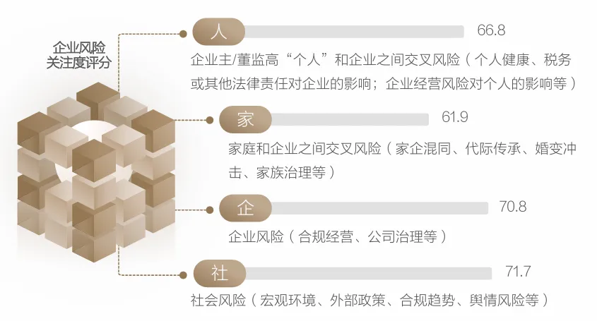 在企业类风险方面,企业主在守财管财过程中面临着来自社会、企业、家庭、个人四方面的多重考验,既怕“天灾”也怕“人祸”。具体来看,宏观社会环境风险最让企业主焦虑,评分71.7分。百年大变局之下,企业主亲身感受到当前整个经济环境的变化,高速发展周期已过、存量时代已来,对未来经济发展信心的不足、对当前社会经济环境的不适应共同引爆了企业主们的群体焦虑。此外,企业家们还焦虑企业自身经营与治理风险。“打铁还需自身硬”,抛开宏观环境影响,企业内部经营风险是否能很好规避是企业家们第二在意的事。