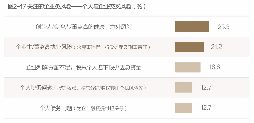 在“人祸”方面,“创始人/实控人/董监高的健康及意外风险”“企业主/董监高执业风险”是企业主们最担心的个人风险点,关注占比明显高于其他风险点。高管一旦重病、发生意外或出现名誉受损、行业处罚、违法犯罪等负面新闻,将直接影响上市公司股价及公司经营稳定性,进而影响企业主个人财富。
