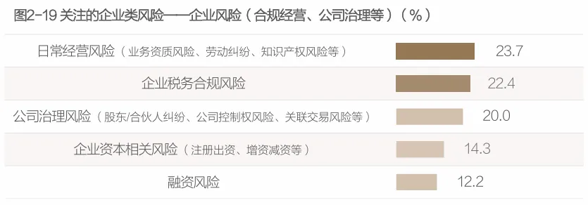 日常经营风险、企业税务合规风险是企业主最担心发生的企业风险。对于大多数企业主来说,融资、增资减资是企业低频行为,并不会经常发生,反而是企业日常经营中会遇到各种意想不到的风险,比如来自员工的劳动纠纷、来自合作伙伴和客户的业务合作争议、来自同业的专利和知识产权纠纷、来自监管的税务合规风险等。因此,企业主们迫切希望能借助专业法律服务或各类风险工具来为企业的长远稳健经营保驾护航。