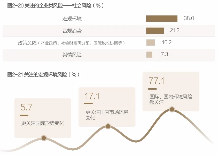 创业难、守业更难。在宏观社会风险方面,企业家们最担心宏观环境对企业的影响,其次是合规趋势、监管动向。具体看,77.1%的企业主表示,无论是国际形势变化、还是国内市场环境变化,都会对企业生死存亡和经营发展造成重要影响,因此需要多加留意、及时应对。近年来国际形势动荡,俄乌战争持续,美国加征关税政策对全球尤其是贸易型企业造成较大冲击,而国内经济正处于转型阵痛期,虽然有政策的积极支持,但市场需求有待激活、市场信心明显不足,这些都让企业主们压力山大。