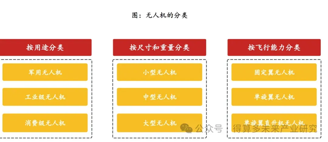 ◥ 无人机总共可分为三类,其中按用途分类可分为军用(侦察、打击、通信中继等)与民用(工业级、消费级)两大分支,工业级无人机进一步细分为农业植保、电力巡检、物流运输等场景;按尺寸和重量可分为小型、中型、大型无人机;按飞行能力可分为固定翼无人机、单旋翼无人机、单旋翼直升机无人机。