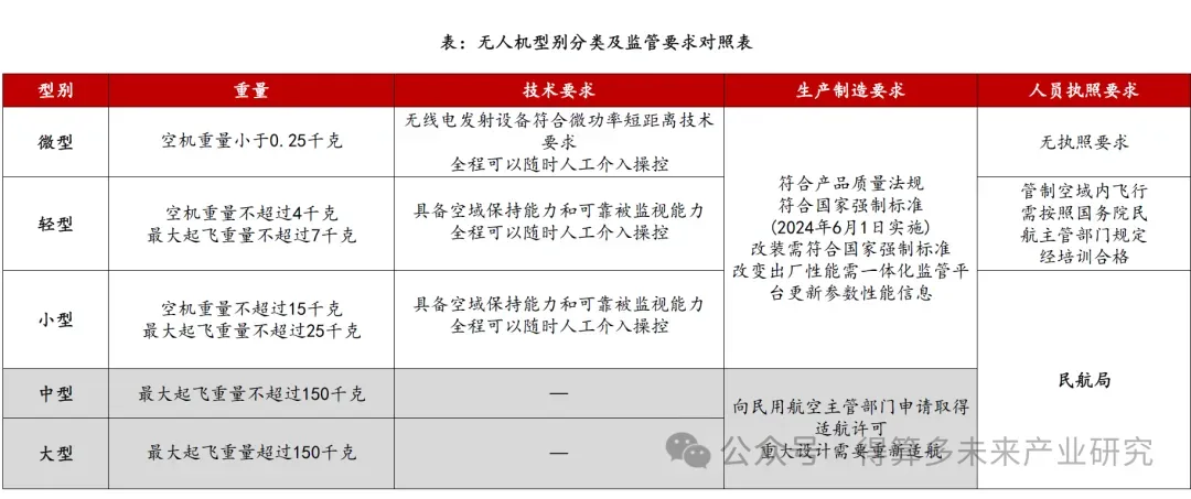 《无人驾驶航空器飞行管理暂行条例》构建重量分级监管框架,将无人机划分为微型、轻型、小型、中型、大型五大类,其中,中型、大型无人机应申请取得适航许可。