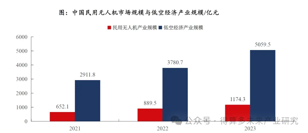 民用无人机为低空经济产业重要组成,低空经济的发展随着无人机产业的发展而壮大,两者趋势相同,2021-2023年民用无人机占低空经济比例为22.4%、23.5%、23.2%。