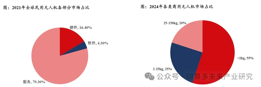 根据《2024全球无人机市场洞察报告》(大数据跨境),商业无人机被定义为用于商业目的的四轴、八轴或六轴飞行器,而不是用于个人和娱乐用途。按照重量细分<2kg、2-25kg、25-150kg占比分别为55%、25%、20%。