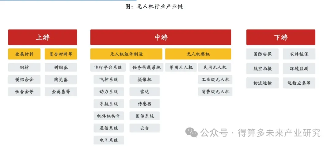 无人机产业链覆盖上游原材料(如复合材料等),中游整机制造与核心零部件,下游民用(航拍)、工业(植保、巡检)、军事(侦察)等多元场景及配套服务。