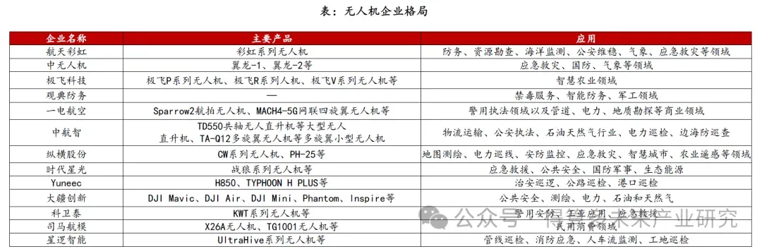 ◥ 整体格局相对分散,竞争较为充分,多数企业主要聚焦细分领域。纵横股份与大疆产品覆盖范围广泛,科比特、观典防务专注巡检安防领域,极飞科技侧重植保领域,飞马机器人、中海达及华测导航聚焦测绘领域。其中,纵横股份作为垂直起降固定翼无人机领域的领先企业,凭借高载荷、长航时的产品优势占据市场重要地位。