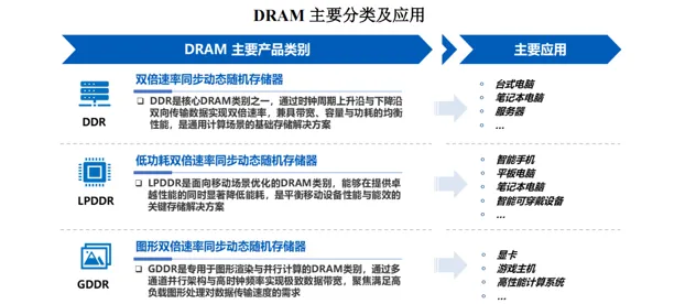 在DRAM发展过程中,DRAM产品类型主要分为DDR(双倍速率同步动态随机存储器)LPDDR(低功耗双倍速率同步动态随机存储器)、GDDR(图形双倍速率同步动态随机存储器)和其他新型高端存储器等。其中,2024年DDR及LPDDR产品占市场主要份额。JEDEC定义并构建了上述标准化的内存技术规格体系,使得各厂商设计的产品满足目标应用的功率、性能和规格要求,具备互换性和兼容性。