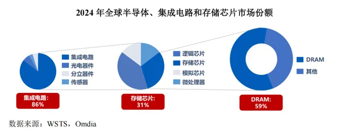 扮演着战略性基础设施的重要角色,是全球半导体市场占比最高的单一品类之一。根据世界半导体贸易统计协会WSTS统计,2024年全球集成电路市场规模为5,395亿美元,占半导体产业整体规模的比例约为86%。其中,全球存储芯片市场规模为1,655亿美元,占集成电路市场规模的比例约为31%。根据Omdia和WSTS数据,DRAM是当前市场规模最大的存储芯片,2024年全球DRAM 市场规模为976亿美元,占存储芯片市场规模的比例约为59%。