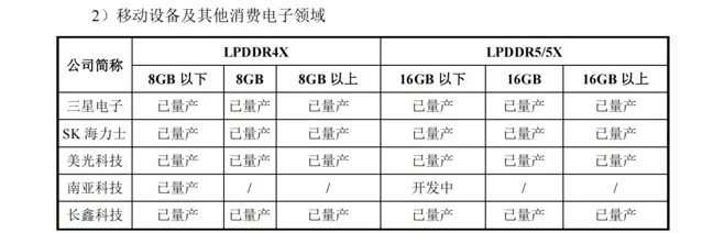 经由前道制造、后道封装测试完成后,DRAM 芯片可直接或进一步制成模组,应用于服务器、移动设备、个人电脑及其他消费电子等下游应用领域。对于下游终端客户而言,容量是其在进行产品选择时的核心考量因素,直接影响着终端的存储承载能力及实际场景的运行表现。区分下游应用领域,截至2025年6月30日,同行业企业产品对比情况如下:
