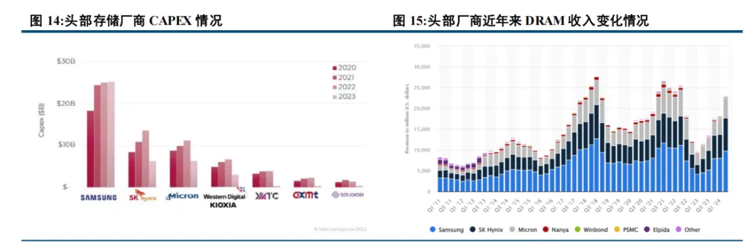 2022 年底以来多家厂商统一减产,DRAM 价格迎来修复。2021 年四季度开始 DRAM 平均价格连续 8 季下跌,2022 年底多家厂商都做出减产决策,希望通过减少供给进而恢复供需平衡。2023 年存储厂商资本开支都有所削减,美光资本开支从 2022 年的 121 亿美元削减至 77 亿美元,降幅达到 36%,海力士资本开支削减从 2022年的 19.7 万亿韩元至 8.8 万亿韩元,同比下降 55%。三星和海力士在 2023 年第三季度的产量相较于第一季度分别下降了 15%和 12%,主动减产效应明显。2023 年下半年开始,DRAM 价格逐渐修复,2024 年第二季度改善明显,三星、美光和海力士的 DRAM 收入都明显回升。