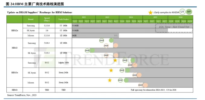 HBM3 与 HBM3E 将替代 HBM2 E成为 HBM市场的主流。2022-2023 年全球 HBM 市场主要以 HBM2E 为主,而 HBM3 与 HBM3E 契合了 AI 服务器需求,2024 年来持续增长,随着其发布与持续放量,2024 年及之后市场需求将向 HBM3 以及更高版本转移,HBM3 与 HBM3E 将成为市场主流 HBM 产品,市占率有望由 2023 年的 33%急速提升至 2024 年的 80%以上。截至目前,三大厂商的 HBM3E 8Hi 都已通过英伟达检验,美光与海力士已经收获英伟达订单并实现量产,同时三大厂商也已送样最新一代产品 HBM3E 12Hi。