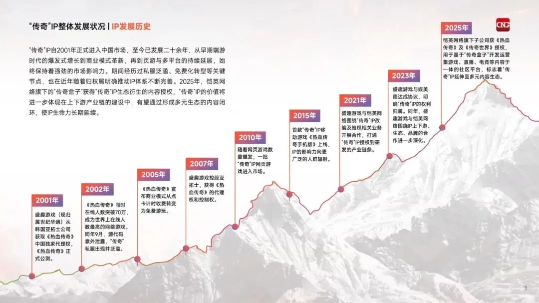 "传奇"IP是目前国内收入产出最高的客户端游戏IP之一,对游戏3用户群体,乃至游戏产业发展均产生了深远的影响。在长达二十余年的运营过程中,"传奇"IP在客户端、移动端、网页端等领域诞生达量精品产品,表现出IP强大的生命力。